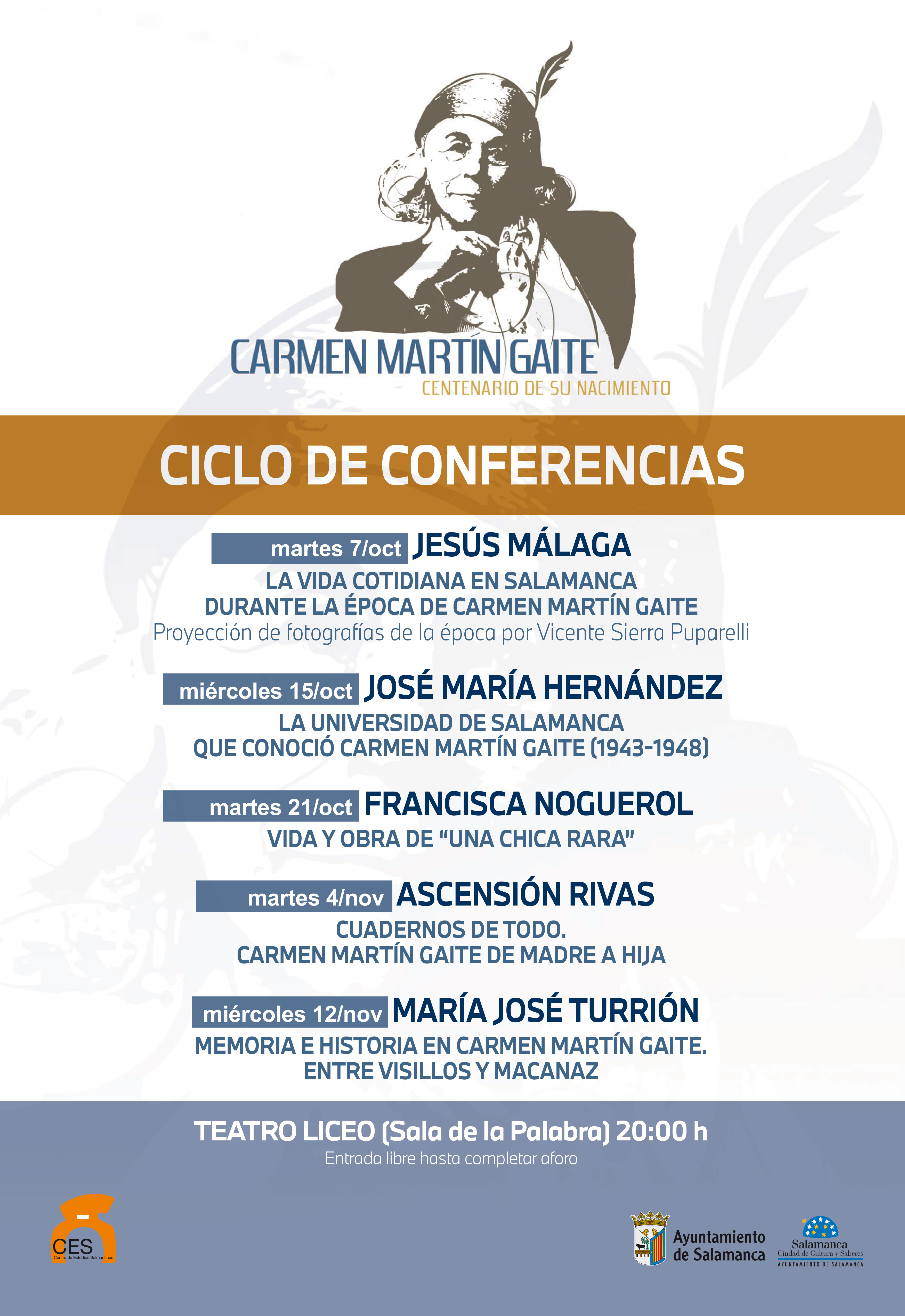 En colaboración con la Fundación Salamanca Ciudad de Cultura y Saberes, el Centro de Estudios Salmantinos ha organizado un Ciclo de conferencias con ocasión del Centenario de Carmen Martín Gaite, una de las escritoras salmantinas contemporáneas más relevantes.